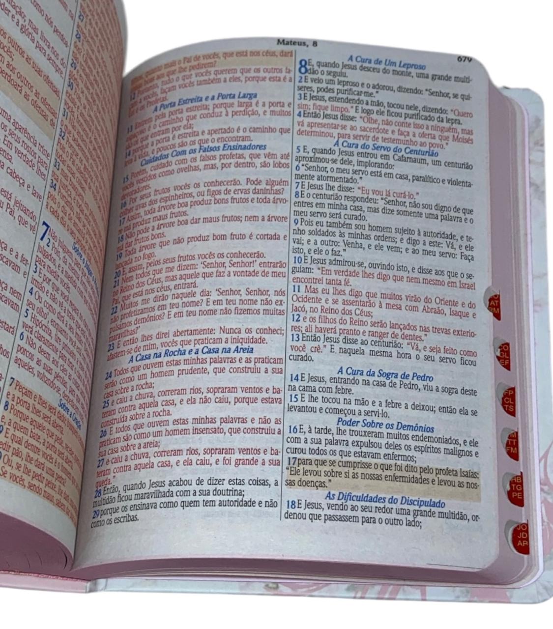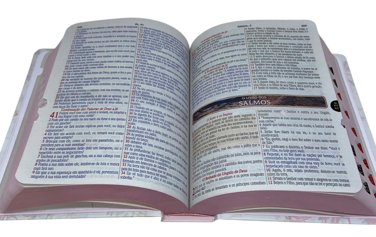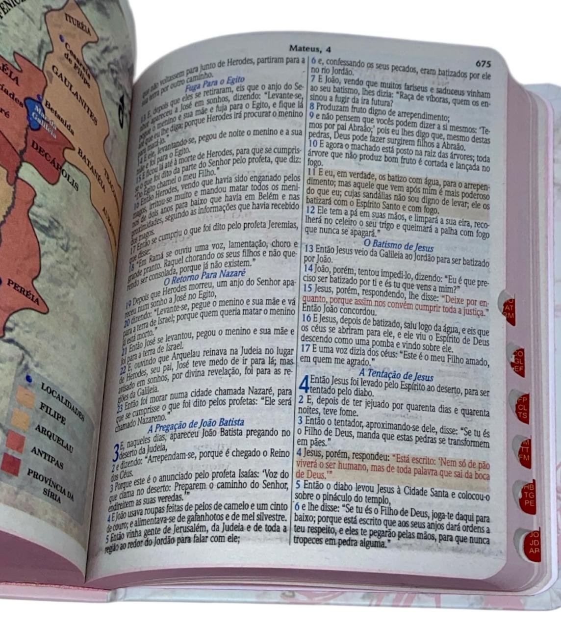 | Contém as palavras de Deus e de Jesus em destaque, promessas e mapas em cor, facilitando a identificação dos versículos e enriquecendo sua experiência de leitura.